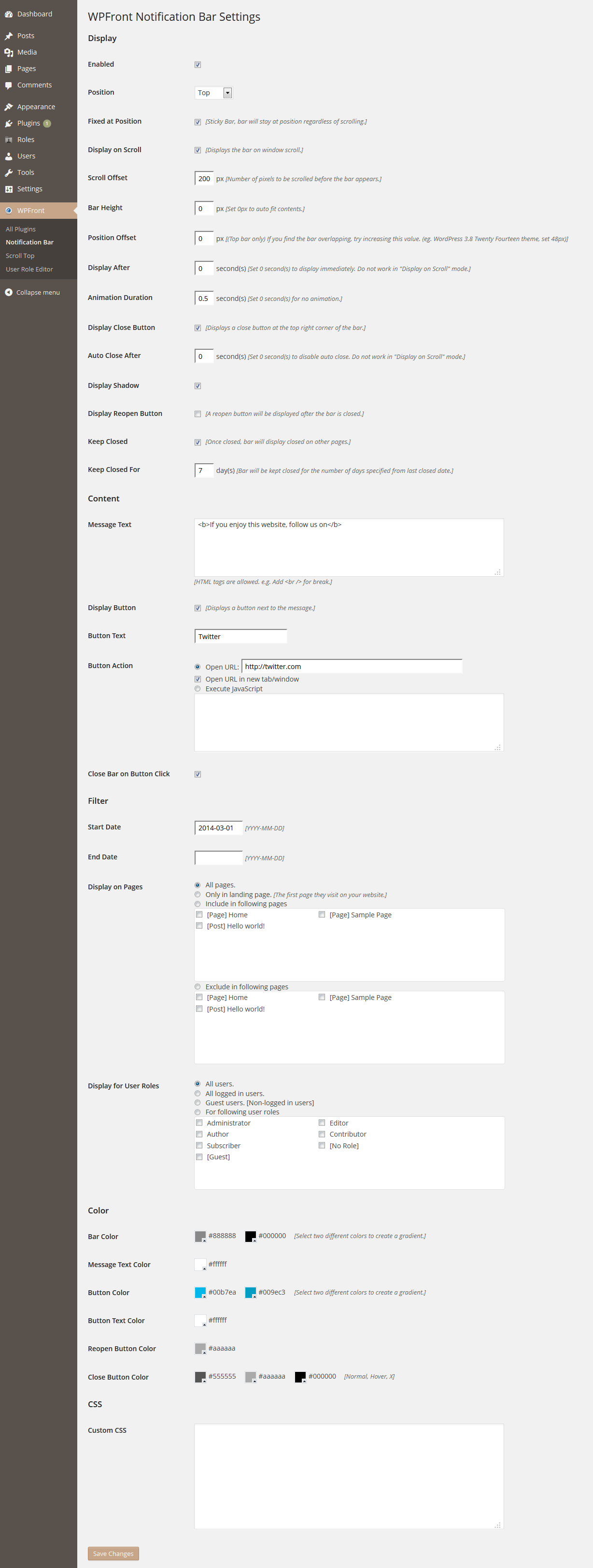Display For User Roles: Allows you to filter the roles the bar will displayed to. If you select “Guest users”, bar will be only displayed for the users who are not logged into you site. “[No Role]” will be used when the user is logged in, but do not belong to any user role. Use “Enable WP eMember integration” to consider WP eMember plugin users as logged in users.